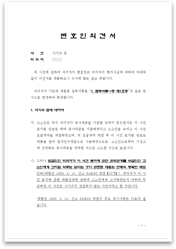 3. 상대방의 고소 내용 중 일부(의뢰인 소유 건축 부지는 담보로 제공되어 있어 공사대금 지급을 위한 담보대출이 어려움, 기성부분 철거 후 잔존한 폐철근을 철거비용으로 충당함, 의뢰인과 상대방 사이 욕설이 오고감)가 사실에 해당하는 사건이었으나, 법리상 고소 죄명이 성립하지 않는 사안임을 강조하였고, 그에 부합하는 증거 및 판례를 제시하였습니다.