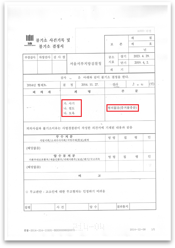 4. 위와 같이 변호한 결과, 검찰은 사기, 절도, 모욕 혐의 모두에 대하여 불기소처분을 하였습니다.