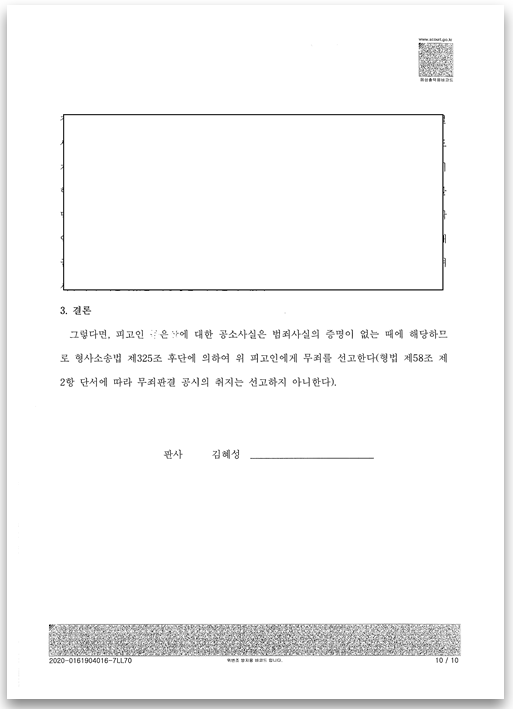 변호인은 증인으로 출석한 고소인과 참고인의 법정진술이 위증이며, 고소 내용 자체가 허위임을 밝혀내는데 성공하였고, 법원은 피고인에 대하여 무죄를 선고하였습니다(반대로 피고인과 공동정범으로 기소된 참고인에 대하여는 유죄판결이 선고됨).