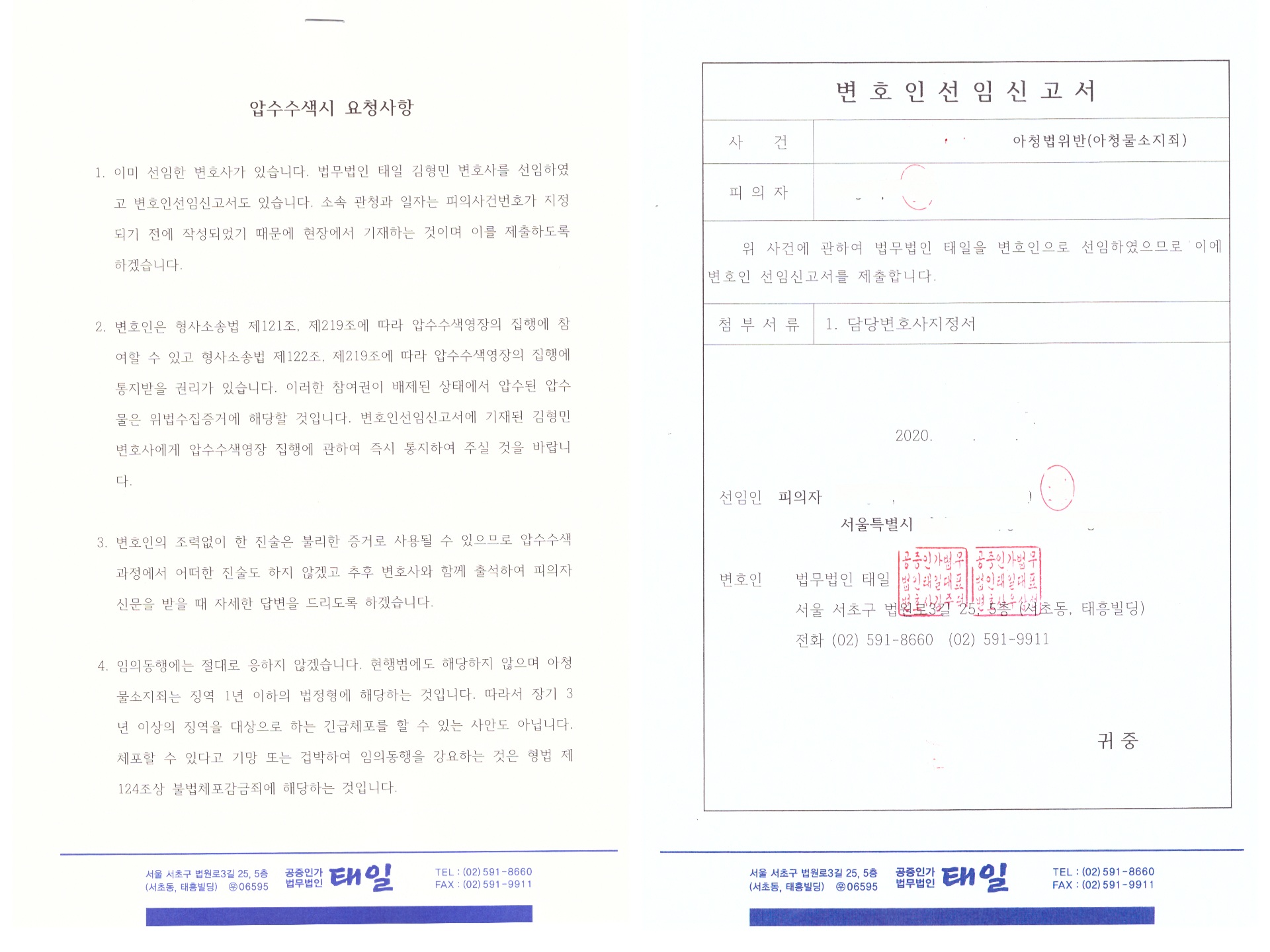 압수수색을 나왔을 때 일단 압수수색 영장을 받아 자세히 보시기 바랍니다. 압수수색영장의 표지만 보여줄 경우 내용을 보여달라고 하고 내용을 잘 살펴보는 것이 필요합니다. 현재 단기에 많은 수의 압수수색영장이 발부되고 있고 수사대상이 많아 압수수색 장소 등이 실제와 달리 잘못 발부받은 경우가 상당히 있습니다. 압수수색 과정에서 하는 답변의 경우 불리한 증거로 사용될 수 있으므로 변호인 조력없이 답변할 의무는 없습니다. 미리 선임계가 제출되어 있지 않다는 이유로 변호인이 아니다라고 뭉개는 경우가 있어 제 의뢰인들에게는 미리 변호인선임신고서와 압수수색시 요청사항을 보내드리고 있습니다.