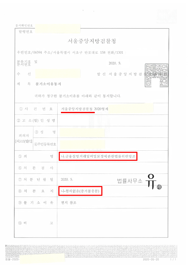 이에 서울중앙지방검찰청은 금융실명거래및비밀보장에대관한법률위반방조에 대하여, 무혐의(증거불충분)처분을 하였습니다.