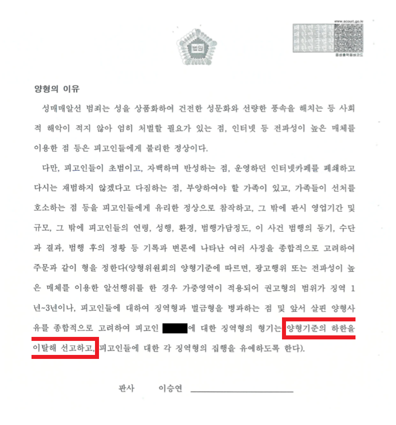 이를 토대로 저는 ① A, B씨는 자신들의 잘못을 모두 인정하고 깊이 반성하고 있다는 점, ② A, B씨는 인터넷 카페를 폐쇄하는 등 다시는 같은 잘못을 저지르지 않겠다고 굳게 다짐하고 있다는 점, ③ A, B씨는 초범이라는 점, ④ A, B씨는 부양할 가족이 있고, 주변 사람들이 선처를 호소하고 있다는 점, ⑤ 영업의 기간과 규모가 그리 크지 않다는 점 등을 재판부에 적극적으로 어필하면서 "비록 A, B씨가 광고 또는 전파성이 높은 매체를 이용한 알선행위를 하여 양형위원회가 정한 양형기준에 따라 가중영역이 적용된다고 하더라도, A, B씨의 양형사유들을 참작하여 이번에 한하여 마지막으로 최대한의 관대한 판결을 부탁드린다"라는 내용의 변론요지서를 작성하여 제출한 뒤 최선을 다하여 변론하였습니다.