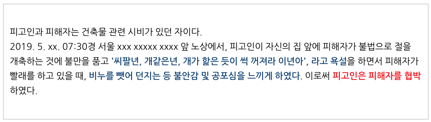 그리고 덧붙여서, 이 사건 공소사실 기재 일자 무렵 피해자가 피고인 주거지 인근에 불법으로 개축공사를 강행하고 있어 평소 피고인과 피해자는 다툼이 있어왔고, 사건 당시에도 그 다툼의 연장선상에서 화가 나 감정적인 욕설 내지는 분노를 표시한 것에 불과하고, 피해자에게 직접적으로 해악을 고지한 것은 없다는 것을 쟁점화 시켰어요.