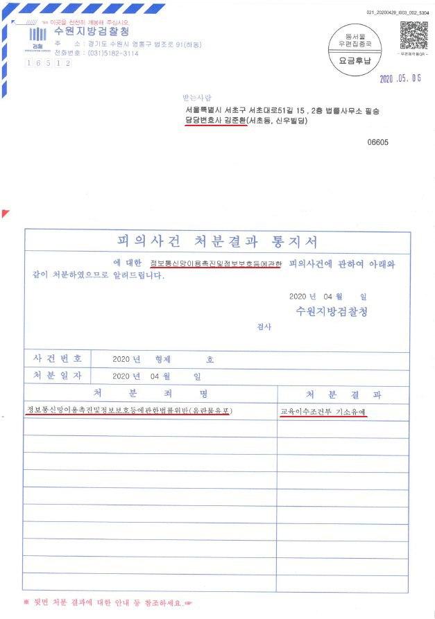 그러나 김준환 변호사와 함께 앞서 말씀드린 다양한 방법으로 경찰, 검찰 수사 단계를 신중히 진행하였고 이에 경찰은 의뢰인님의 사건을 불법촬영물유포가 아닌 "음란물유포"로 수사를 진행하였고, 수원지방검찰청은 의뢰인님을 "성구매자 교육이수 조건부 기소유예"처분을 내렸습니다.