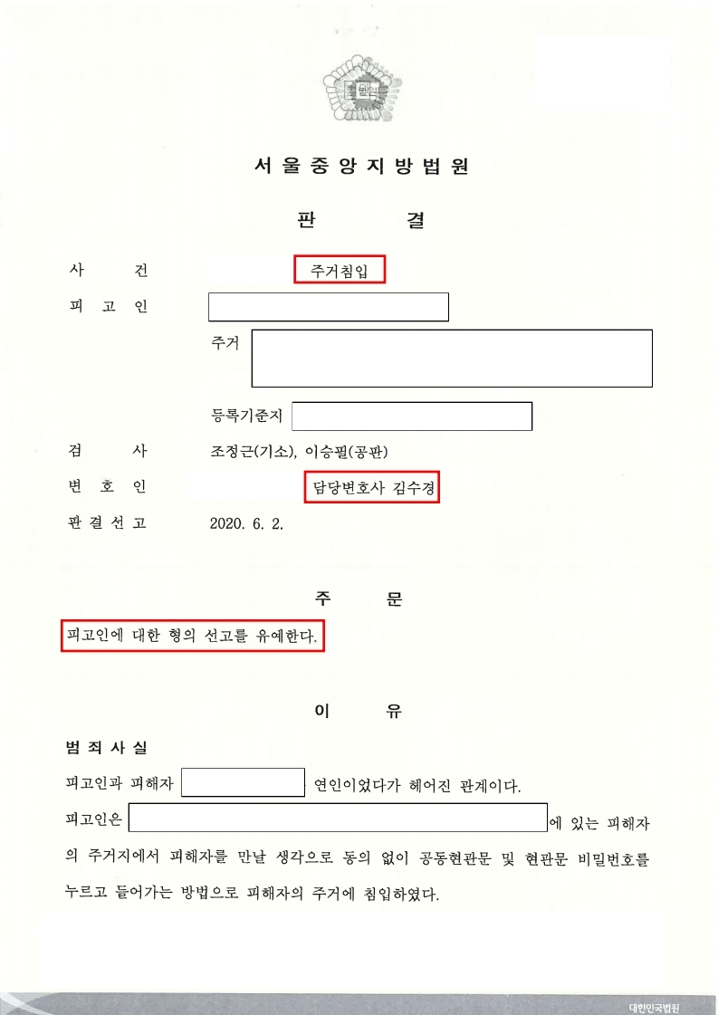 - 의뢰인이 주거에 침입한 사실이 있기는 하지만 그 피해의 정도가 매우 경미했다는 점을 강조하였습니다. (주거 침입 시간대는 낮시간이어서 추가적인 범행의 가능성이 전혀 없었다는 점, 교제 도중 알려준 비밀번호를 이용하여 침입한 점 등)