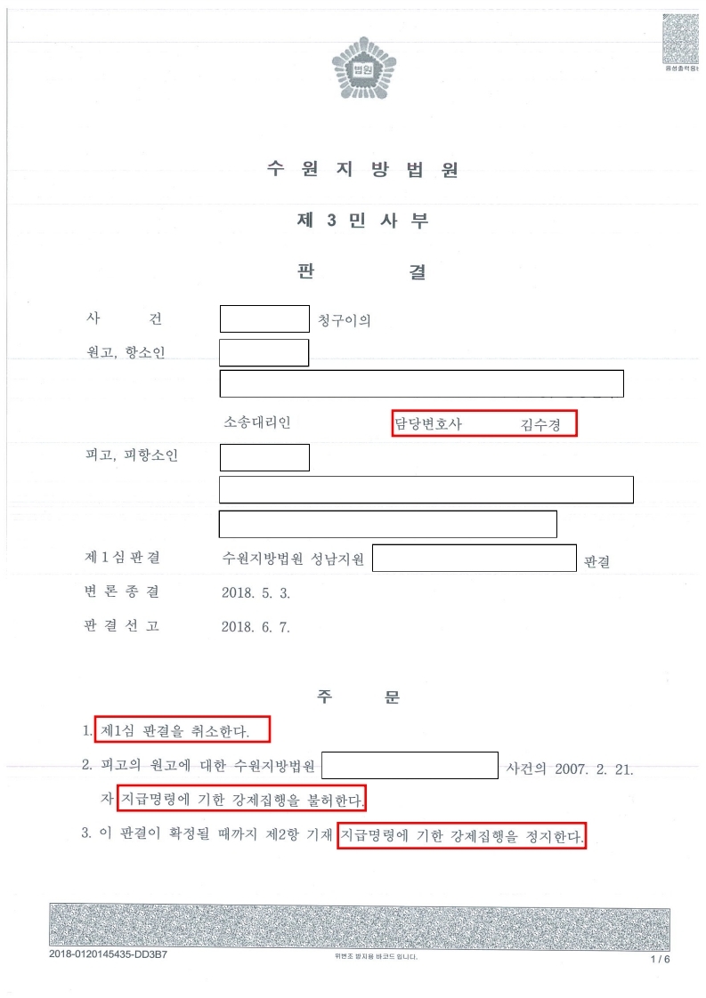 이러한 주장이 받아들여져, 법원은 1심을 취소하고 진행 중인 강제집행을 불허시키는 판결을 하였습니다.