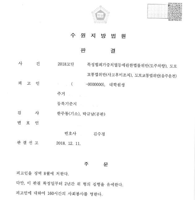 법원은 위와 같은 주장을 받아들여, 의뢰인에게 특가법(도주운전)죄에 대해서 무죄를 선고하였습니다.