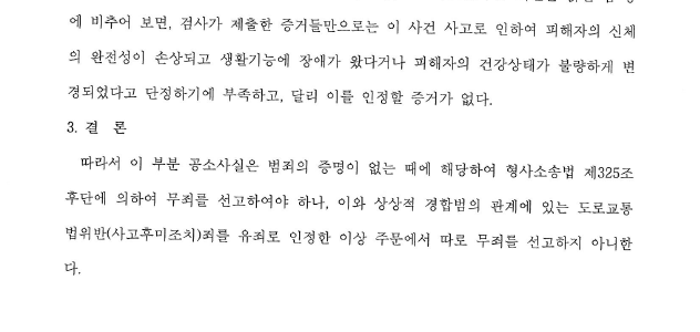 또한 도주운전죄의 상해라 함은 굳이 치료가 필요 없을 정도의 경미한 경우여서 건강상태를 침해했다고 보기 어려운 경우는 제외한다고 보아야 합니다. 피해자는 사고 다음날 병원에 내원은 했지만 약은 따로 받지 않는 등 치료가 필요 없는 상태였기 때문에 '상해'가 인정될 수 없어 도주운전죄가 아니라고 주장하였습니다.