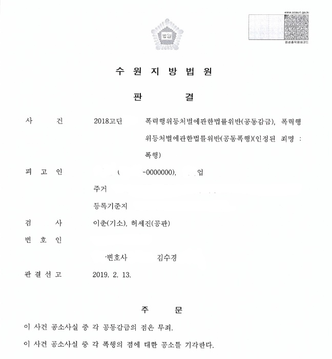 법원은 이러한 주장을 받아들여, 공동감금에 대해서 무죄를 선고하였고, 공동폭행이 아닌 단순폭행죄를 인정하면서 이미 피해자가 고소취하서를 제출한 바 있으므로 공소기각을 선고하였습니다.