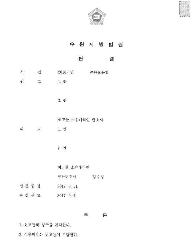 이러한 주장이 받아들여져, 법원은 위 공유물분할청구를 기각하고 해당 토지가 종중의 토지임을 확인하여 주었습니다.