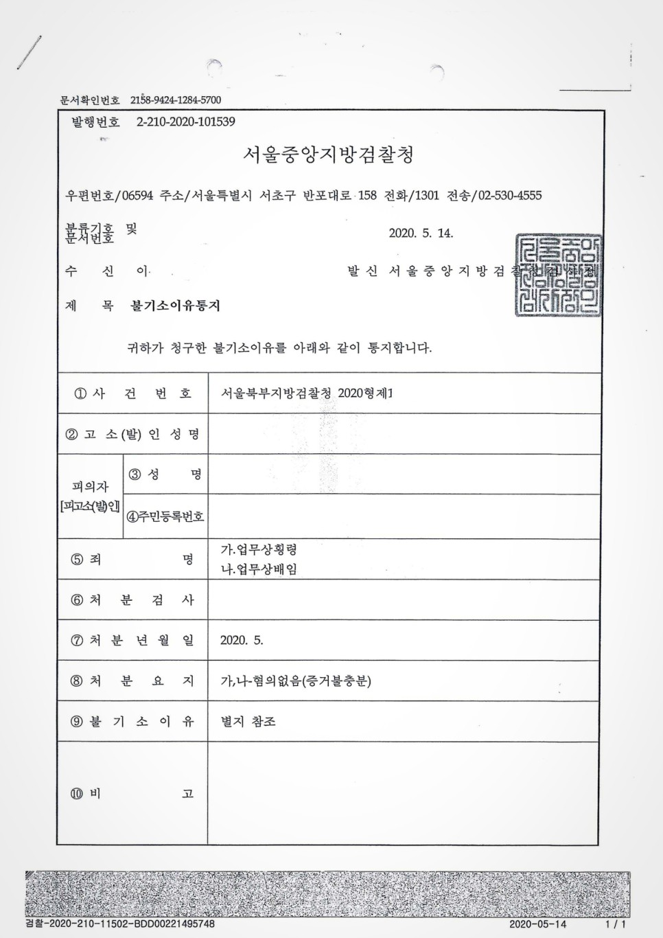 - 검찰의 처분 결과 - 혐의없음(증거불충분)