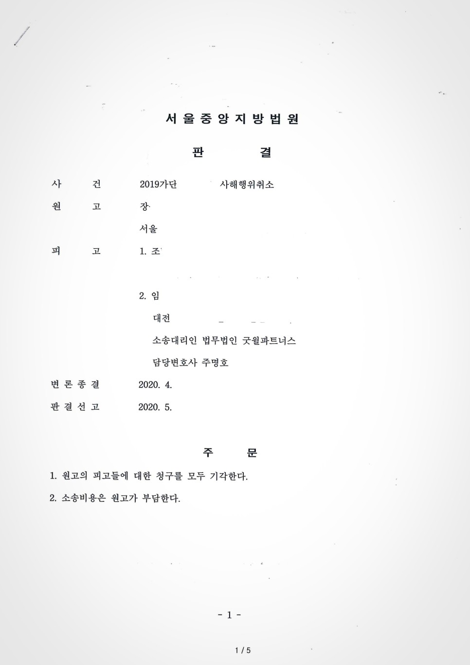 의뢰인과 본 변호사의 주장이 재판부에 모두 받아들여져 결국 원고 청구 기각이 되었습니다.