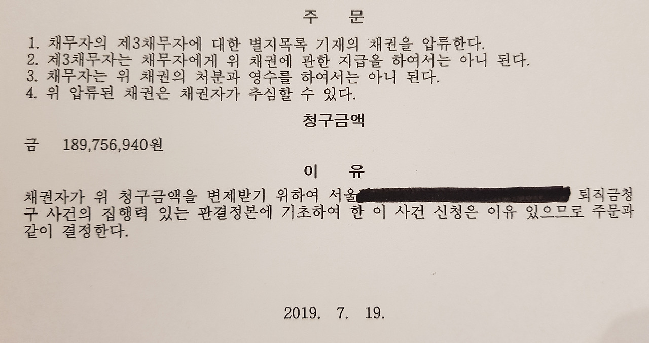 2019. 7. 19. 채권압류 및 추심명령 인용_ 주요 법인계좌 모두 차단