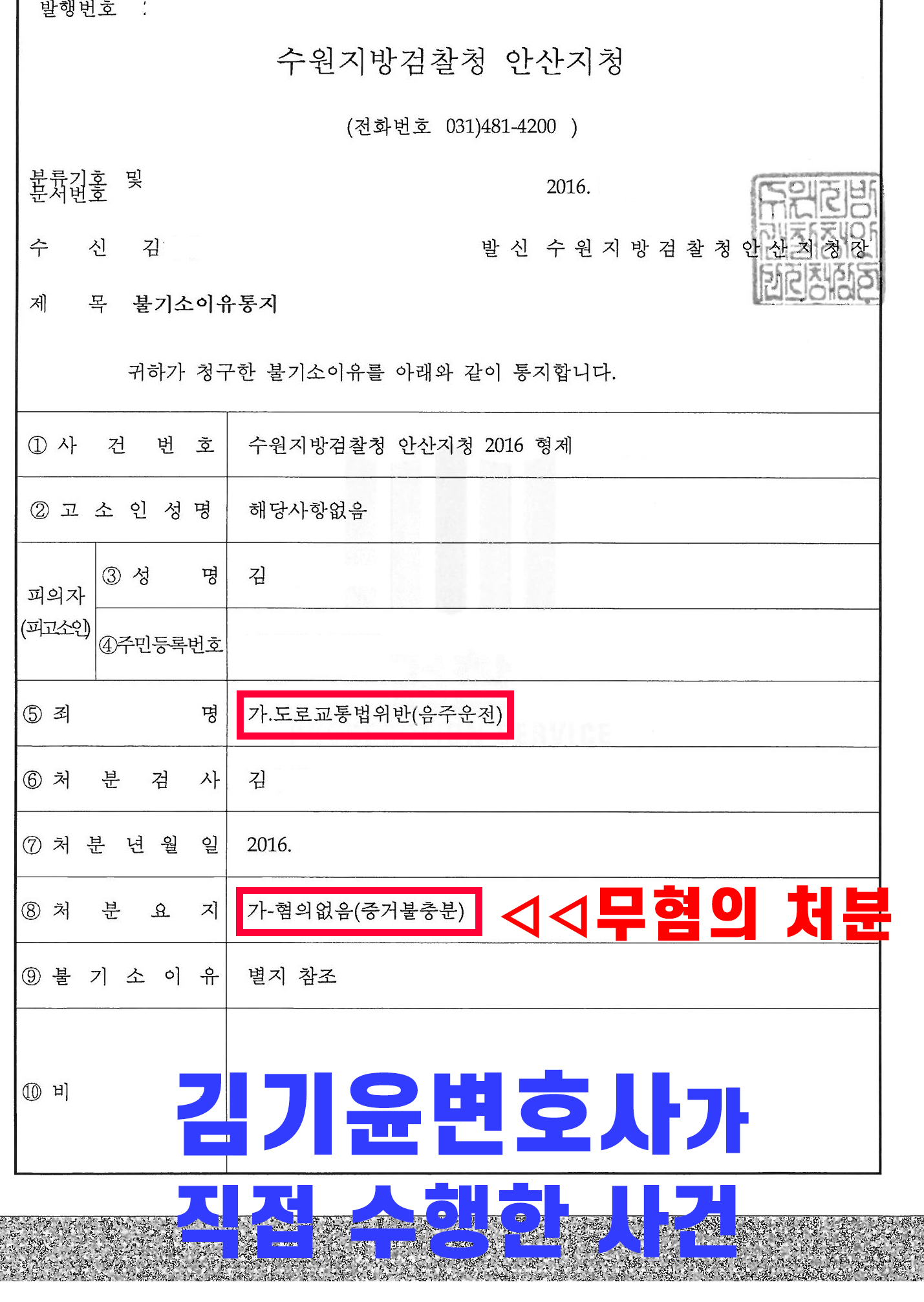 변호사로써 "수면 중 음주운전"으로 인하여 처벌받은 판례를 조사하기 시작하였으며, 유사한 사안에서 "이 사건 승용차에 탄 후 계속 잠을 잤을 뿐이라는 피고인의 진술 등을 종합하면 피고인이 잠결에 이 사건 승용차의 사이드브레이크와 자동변속기어를 건드린 결과 위 승용차가 앞으로 전진하게 되었다고 추정할 수 있을 뿐, 피고인이 이 사건 승용차를 운전할 의도로 위와 같이 자동차를 조작하였다고 보기에 부족하고"라고 판시한 판결을 찾아 이 사건에서도 유사적용할 수 있는 증거 등을 수집하였습니다. 그 결과 변호인이 제출한 의견서를 반영하여 검찰은 불기소처분을 하였습니다. 위 사안에 대한 불기소통지서와 불기소처분이유서는 아래와 같습니다.