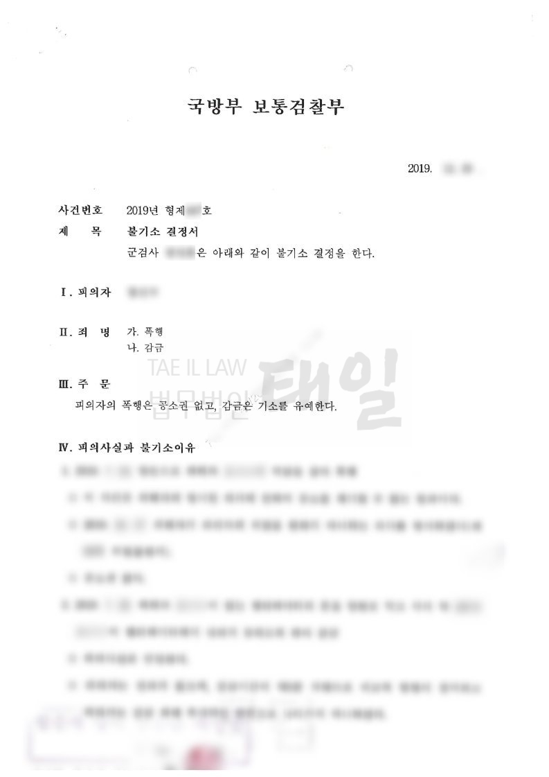 본 건은 피해자와 합의를 하여 반의사불벌죄에 해당하는 폭행 혐의에 대해서는 공소권 없음 처분을 받았고, 양형과 관련한 주장을 하여 감금 혐의에 대해서도 기소유예 처분을 받을 수 있었습니다.