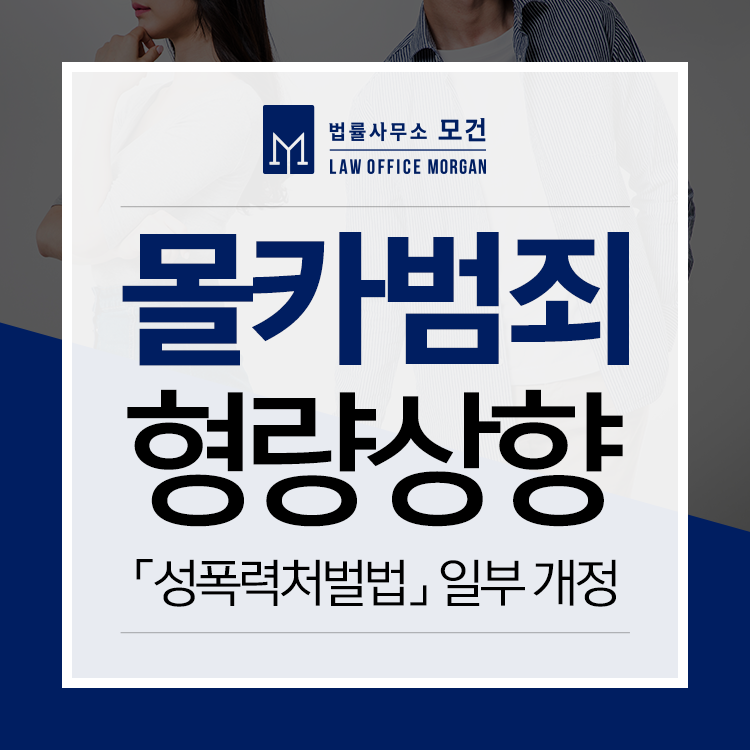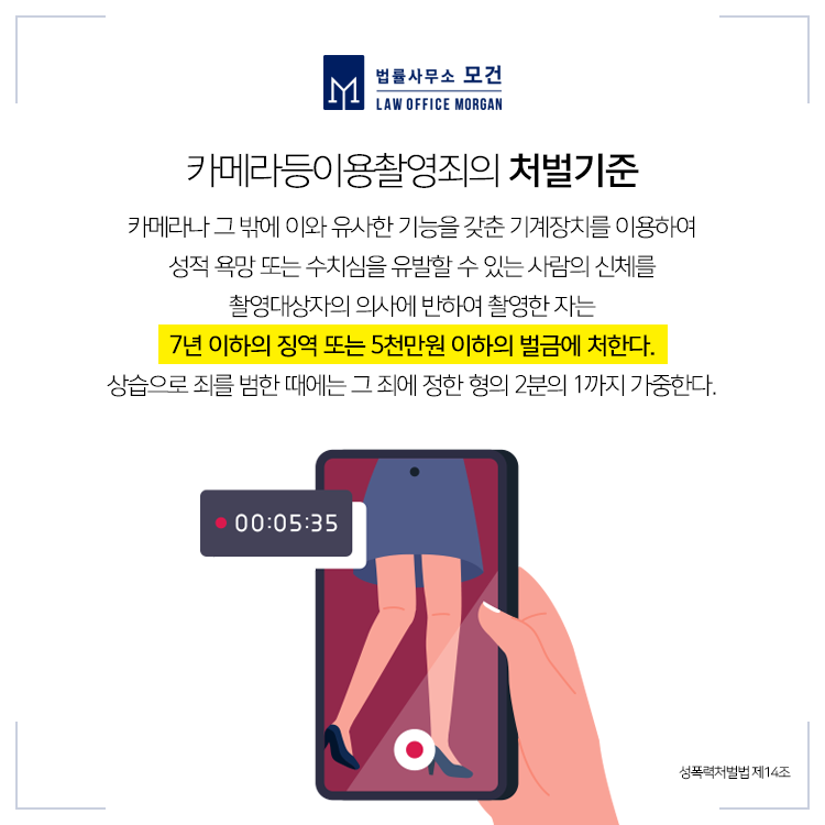 우리가 흔히 '몰카' 라고 하는 카메라등이용촬영죄는 카메라나 그 밖에 이와 유사한 기능을 갖춘 기계장치를 이용하여 성적 욕망 또는 수치심을 유발할 수 있는 사람의 신체를 촬영대상자의 의사에 반하여 촬영한 자를 처벌하는 규정으로 기존 형량은 5년 이하의 징역 또는 3천만 원 이하의 벌금이었으나, 이번 개정으로 7년 이하의 징역 또는 5천만 원 이하의 벌금으로 상향되었습니다.