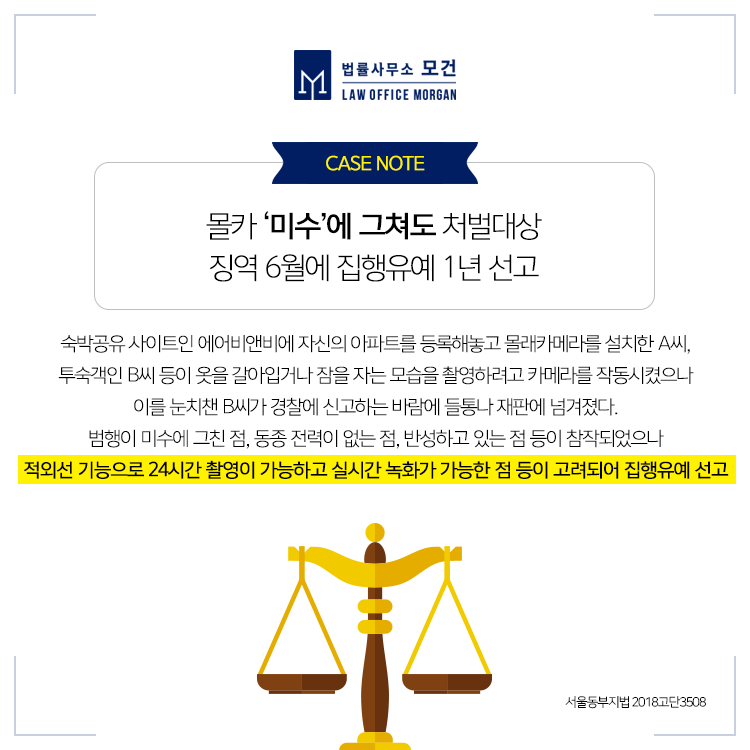 최근 버닝썬, n번방 등 불법촬영물과 관련한 범죄들이 잇따라 발생하면서 카메라등이용촬영죄에 대한 강력한 처벌이 촉구되고 있습니다. 특히 이번 법개정으로 인해 그 처벌기준이 상향됨에 따라 카메라등이용촬영죄의 혐의를 받고 계시다면 자신의 혐의보다 과도한 처분이 내려지지 않도록 성범죄 형사전문변호사의 도움을 받으시기 바랍니다.