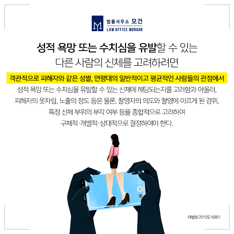 「성폭력처벌법」 제14조 제1항은 '성적 욕망 또는 수치심을 유발할 수 있는 사람의 신체'를 상대방의 의사에 반하여 촬영할 것을 기본요건으로 하고 있습니다. 이는 인격체인 피해자의 성적 자유와 함부로 촬영당하지 않을 자유를 보호하기 위한 것입니다.