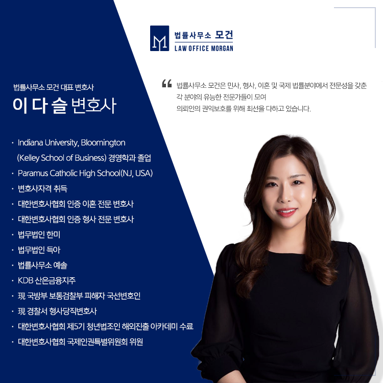 법률사무소 모건의 이다슬 대표 변호사는 대한변호사협회로부터 승인받은 '이혼전문변호사'이자 풍부한 해외경험으로 국제 법률업무에도 탁월한 성과를 거두고 있습니다. 또한 별도의 통번역전문팀을 갖추고 있는 만큼 의사소통이나 법률 해석에 어려움없이 이혼소송을 진행하실 수 있습니다.