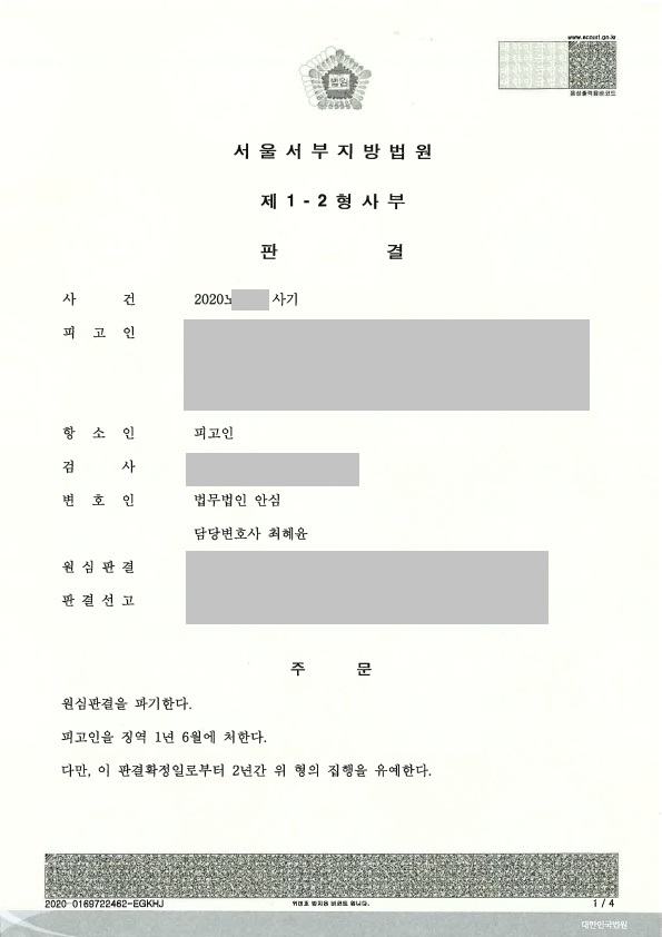 의뢰인은 1심에서 징역 1년 6개월의 실형을 선고받고 법정구속되었습니다.