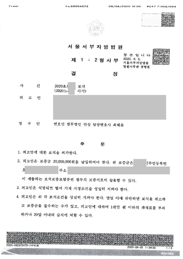 합의되자마자 보석허가청구서를 제출하고 공판기일과 같은 날로 보석심문기일이 정해졌으며 심문기일이 진행된 다음 날 바로 보석이 허가되었습니다.