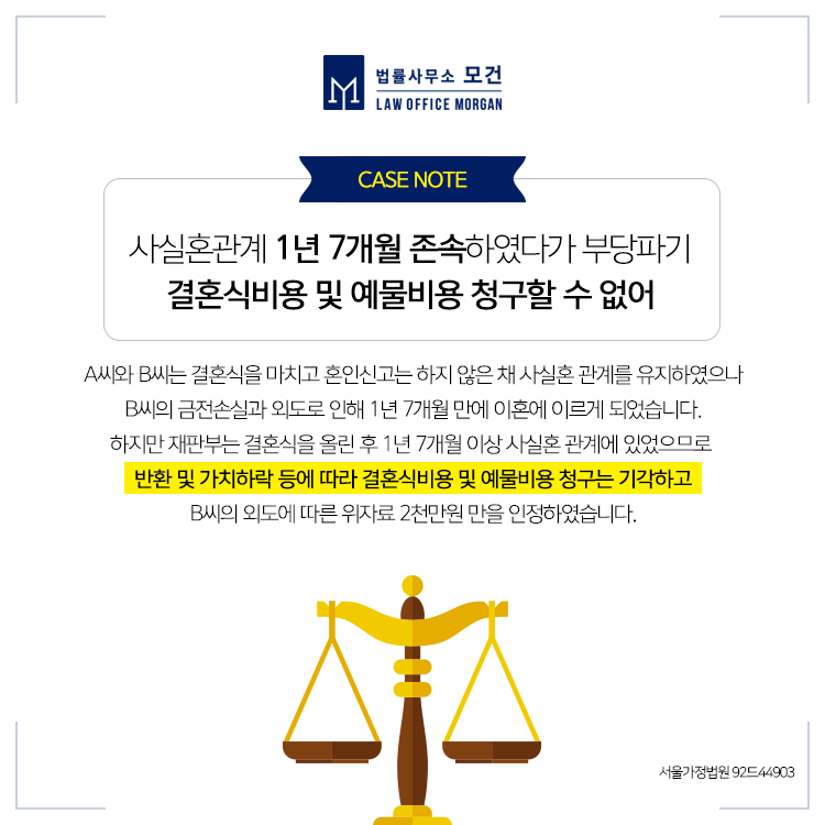 예물이나 가재도구 등은 일방이 구입하여 신혼집에 두고 있다 하더라도 그 소유는 일방에게 속한다고 할 것이므로 그 반환을 구하거나 원상회복으로 반환을 구할 수 있습니다. 또한 혼인 후 동거할 주택구입 명목으로 상대 배우자에게 금원을 교부한 경우에도 혼인이 단기간에 파탄되었다면 그 금원은 특별한 사정이 없는 한 전액 반환되어야 합니다.