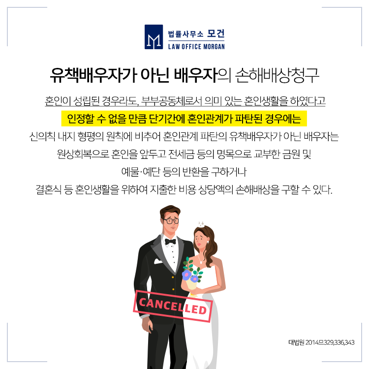 결혼한 지 단기간에 혼인이 파탄되었다고 하더라도 이혼의 과정은 복잡하고 어렵습니다. 또한 이혼 과정에서도 유책배우자가 있을 수 있고 유책배우자의 경우 반환청구의 권리가 없기 때문에 이로 인해 갈등의 골이 더욱 깊어질 수 있으므로 이를 법리적으로 접근하여 중재하고 의뢰인에게 가장 유리한 결과를 이끌어내기 위한 변호사의 조력이 꼭 필요합니다.
