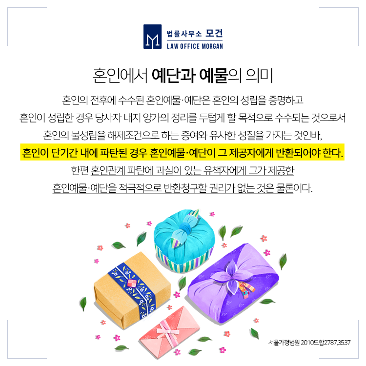 판례에서는 혼인예물·예단은 혼인의 성립을 증명하고 당사자 내지 양가를 두텁게 할 목적으로 수수되는 것으로서 혼인의 불성립을 해제조건으로 하는 증여와 유사한 성질을 가진다고 보고, 혼인이 단기간 내에 파탄된 경우에는 혼인의 불성립에 준하여 그 제공자에게 반환되어야 한다고 보고 있습니다. 그에 반해 유책배우자는 혼인예물·예단의 반환청구 권리가 없습니다.