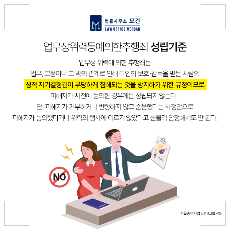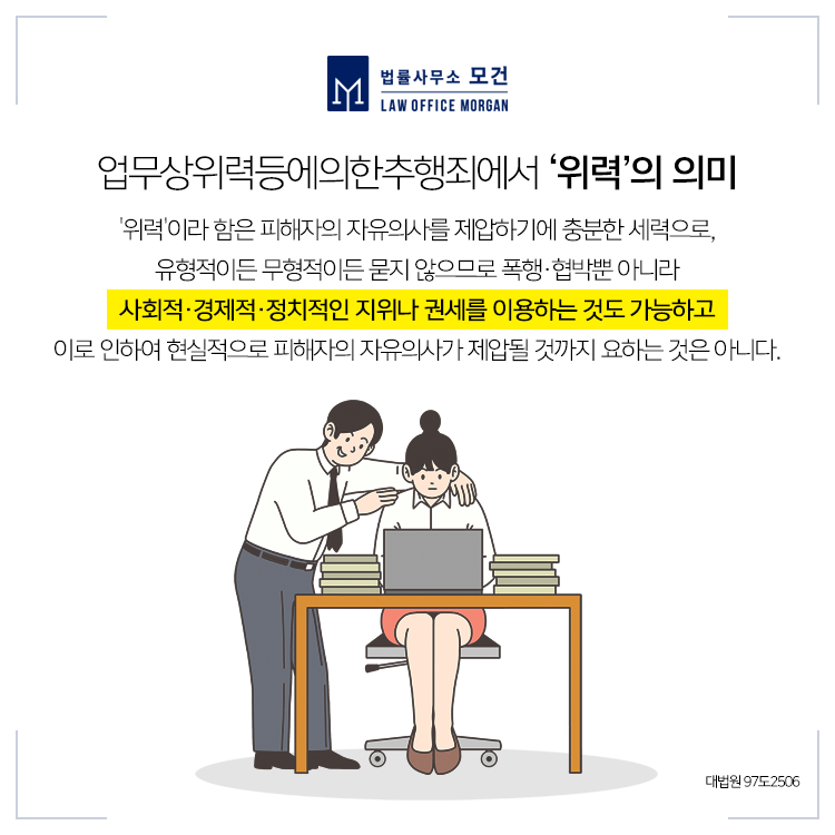 최근 대법원 판례에서는 경력직으로 2개월 먼저 입사한 상사가 신입사원을 성추행한 경우도 업무상위력에 의한 추행으로 봐야 한다고 보았는데요. 입사 간격이 2개월에 불과하지만 경력직과 신입사원의 지위를 고려하면 지시·감독을 받는 관계에서 이뤄진 위력에 의한 추행이라고 본 것입니다.