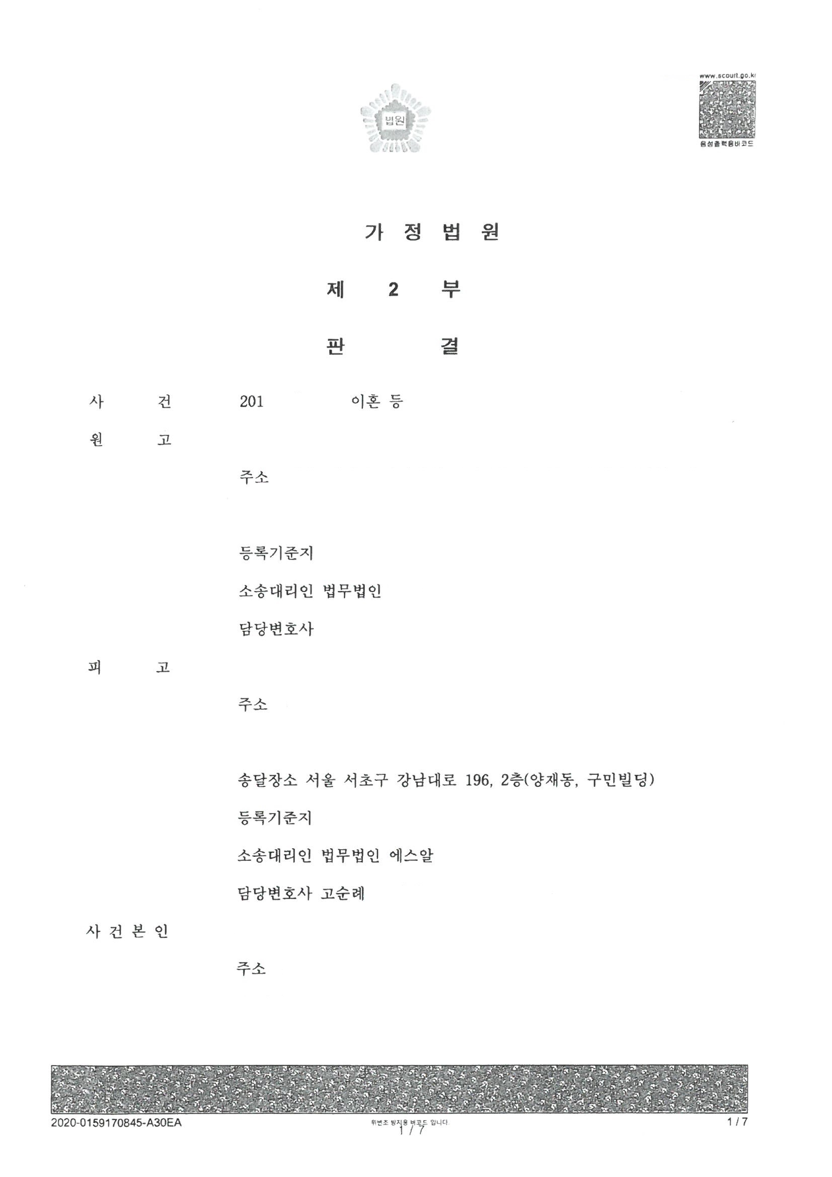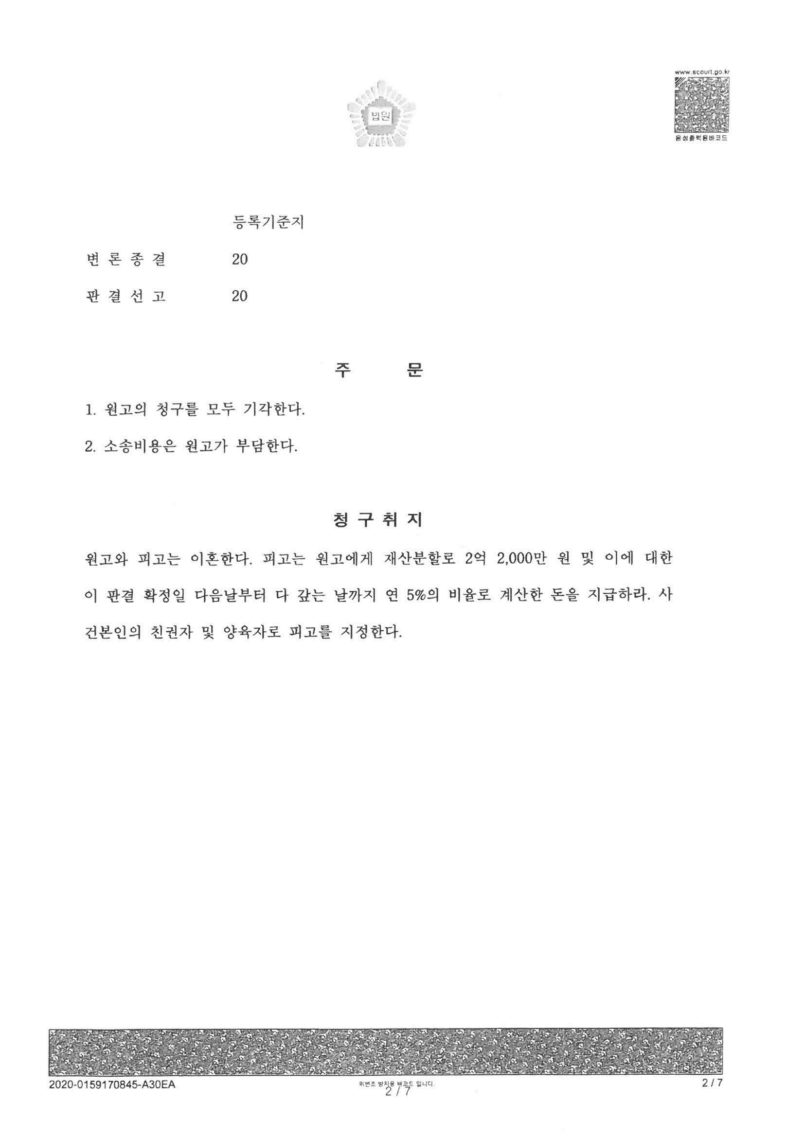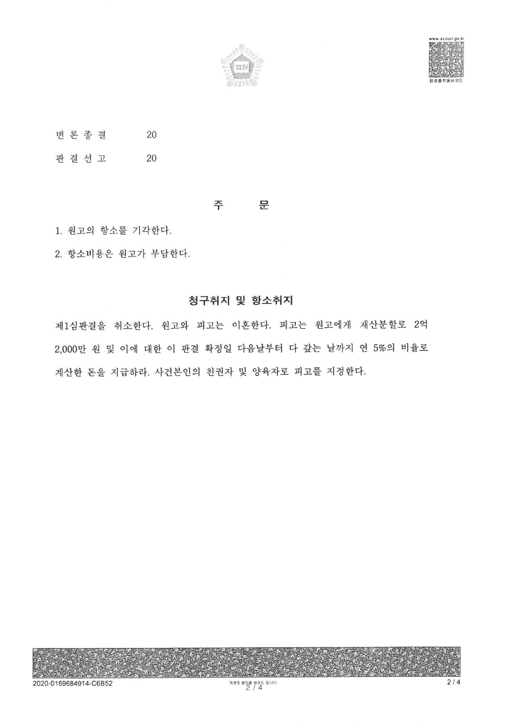 승소하였고, 남편이 항소를 하였으나 항소기각 후 대법원에 상고를 하지 않아서 확정된 사건입니다.