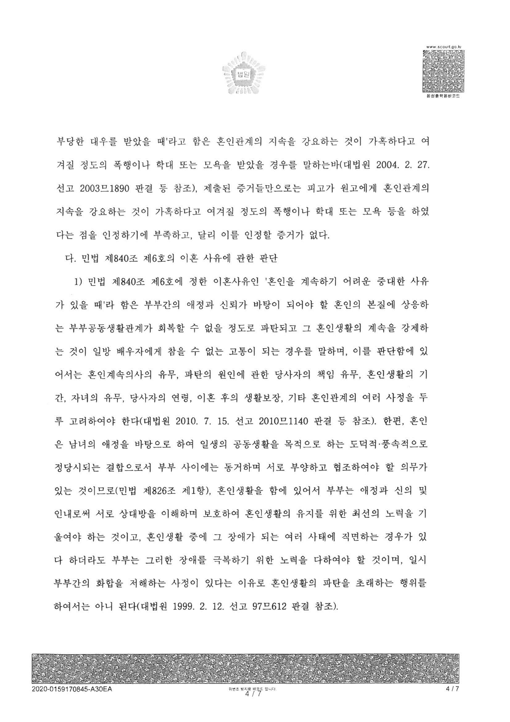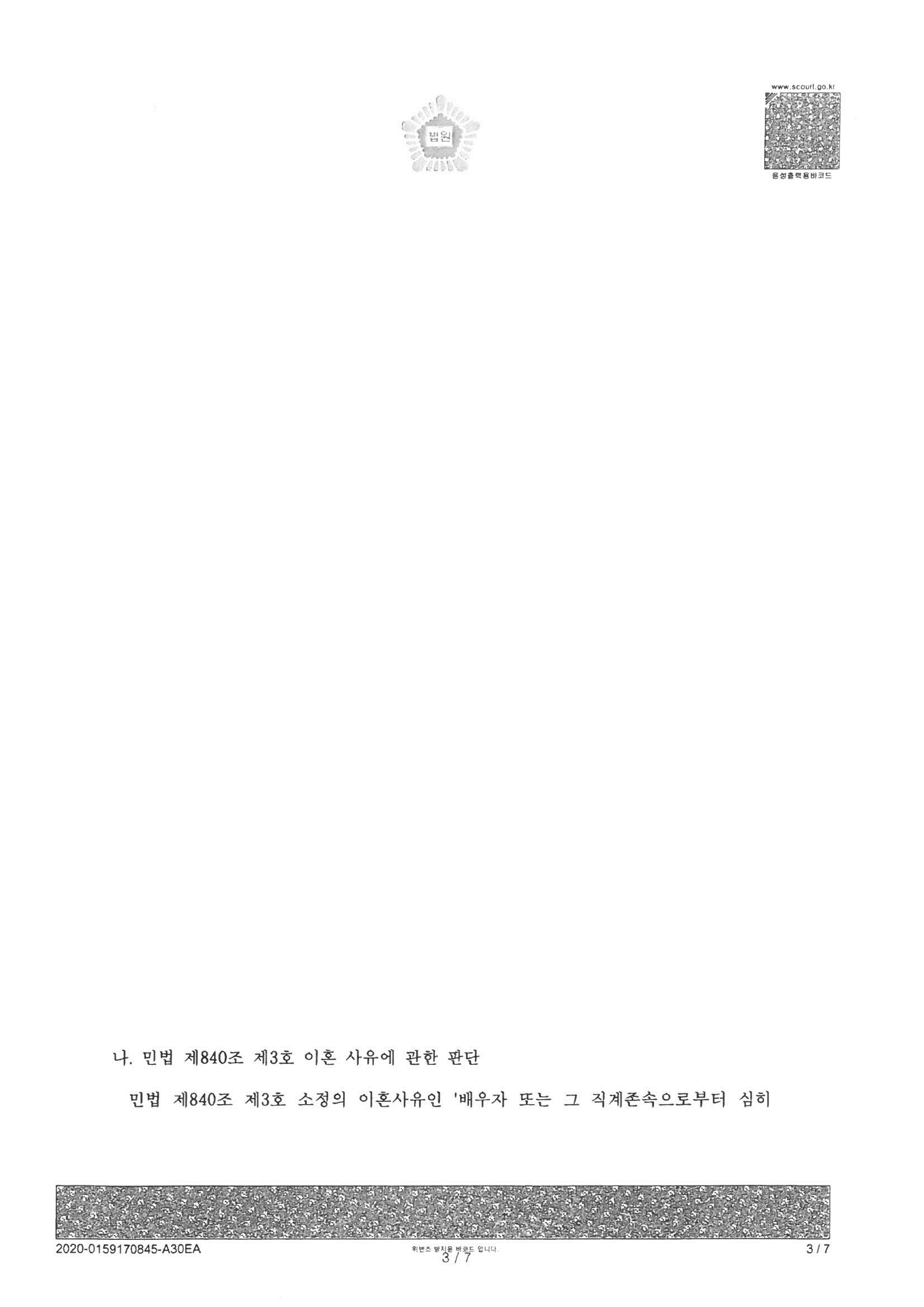 파탄되었고, 이는 민법 840조 제 3호, 6호에 정한 재판상 이혼사유에 해당된다고 주장하였던 사건입니다.