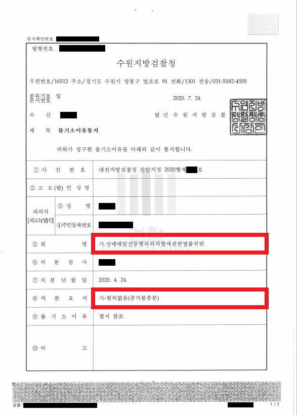 이러한 저의 조력을 바탕으로 A씨는 '혐의없음(증거불충분)' 처분을 받음으로써 억울하게 성매수자가 될 위기에서 벗어날 수 있었습니다.