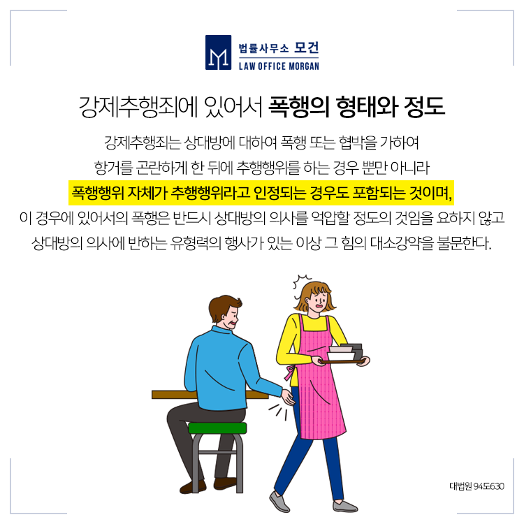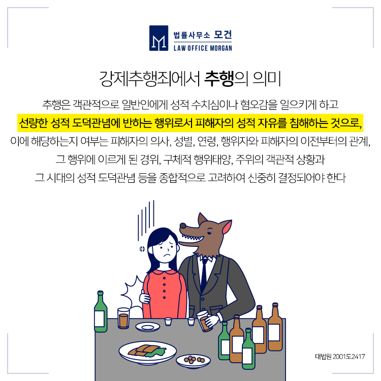 강제추행죄는 폭행 또는 협박으로 사람에 대하여 추행을 한 자에 대해 10년 이하의 징역 또는 1천500만 원 이하의 벌금에 처하는 「형법」 제298조에 의한 범죄입니다. 강제추행죄는 '곰탕집 성추행 사건'으로 잘 알려져 있는데요. 성추행 여부를 둘러싸고 진실공방이 펼쳐졌던 해당 사건은 사건 발생 2년 만에 결국 강제추행 혐의로 기소된 A씨에게 징역 6개월에 집행유예 2년을 선고한 원심이 확정되었습니다.