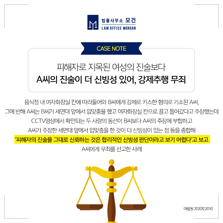 또한 재판부는 'B씨가 즉시 거부의사를 표하지 않았더라도, A씨의 행위에 동의했다거나 B씨의 의사에 반하지 않았다고 쉽게 단정해서는 안된다'며 A씨의 강제추행 혐의를 인정하였습니다(대법원 2019도15994).