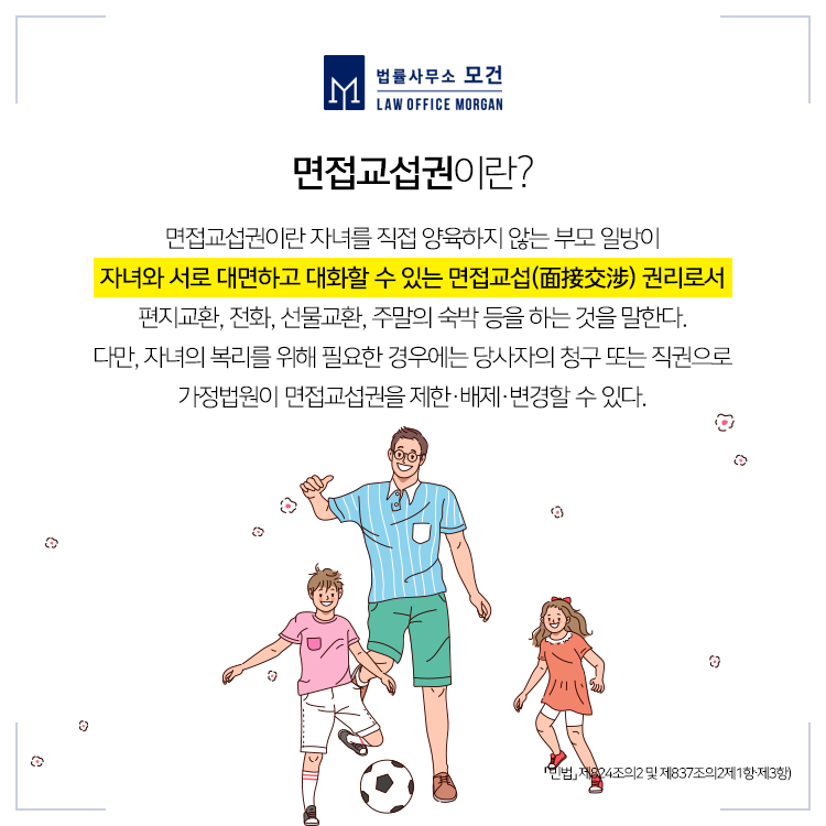 이 과정에서 발생하는 것이 '면접교섭권' 입니다. 면접교섭권은 부부가 이혼 뒤 자녀를 양육하지 않는 부모(비양육친)가 가지는 권리로 자녀와 만나거나 전화 또는 편지 등을 할 수 있는 권리입니다. 그런데 이혼 후 자녀의 양육권을 가진 자(양육친)가 상대방의 면접교섭권을 방해하거나 불이행하는 경우가 있습니다. 이 경우 비양육친이 할 수 있는 대응법에 대해 알아보도록 하겠습니다.