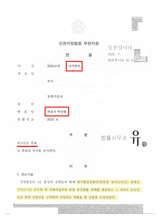 그런데 얼마 후, 경찰서로 부터 A씨의 계좌가 보이스피싱 범죄에 이용되었다며 '사기방조죄 혐의'로 조사를 받으러 오라는 연락이 옵니다. 의뢰인은 경찰~검찰 수사단계까지, 자신의 사안에 대해 가볍게 생각하고 별다른 대처없이 조사를 받다가, 재판으로 회부되었다는 소식을 듣고 로펌 유(唯)에 사건을 의뢰하셨습니다.