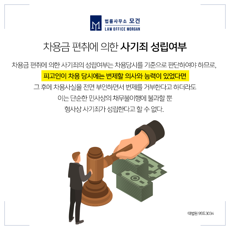 사기죄는 채무자가 돈을 빌리고 갚지 않는 것 자체로써 당연히 성립되는 것이 아니라, 채무자가 돈을 빌리는 시점에서 차용액에 대해 편취의 고의 의사를 가지고 돈을 빌리는 경우에 성립될 수 있습니다.