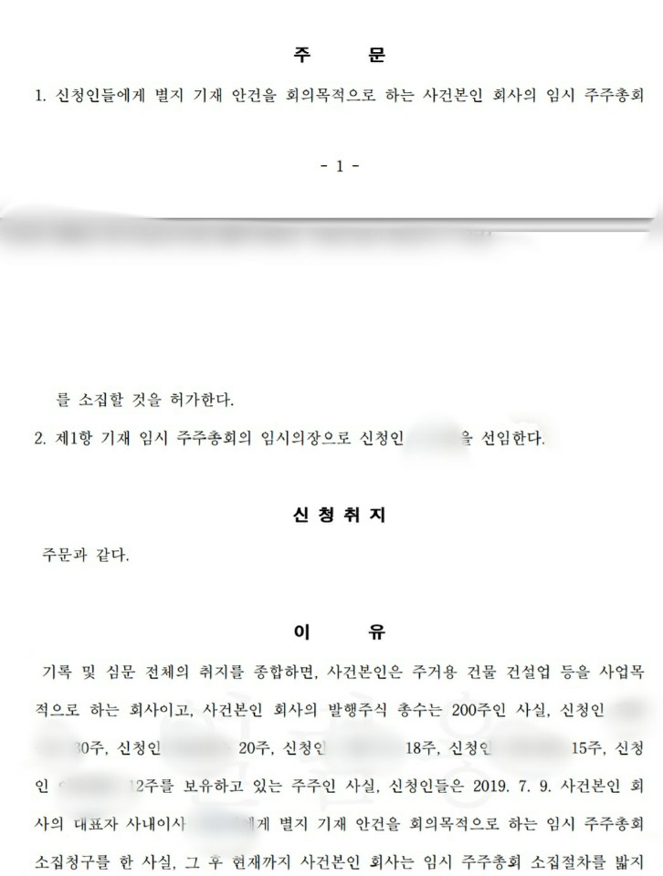 6. 이후 법원이 지정한 기일에 임시주주총회를 소집하여, 해당 주주총회에서 필요한 의결사항들을 주주들이 모두 처리하여, 독단적 경영을 일삼던 대표이사를 상대로 원하는 바들을 성공적으로 얻어내었던 분쟁 해결사례.