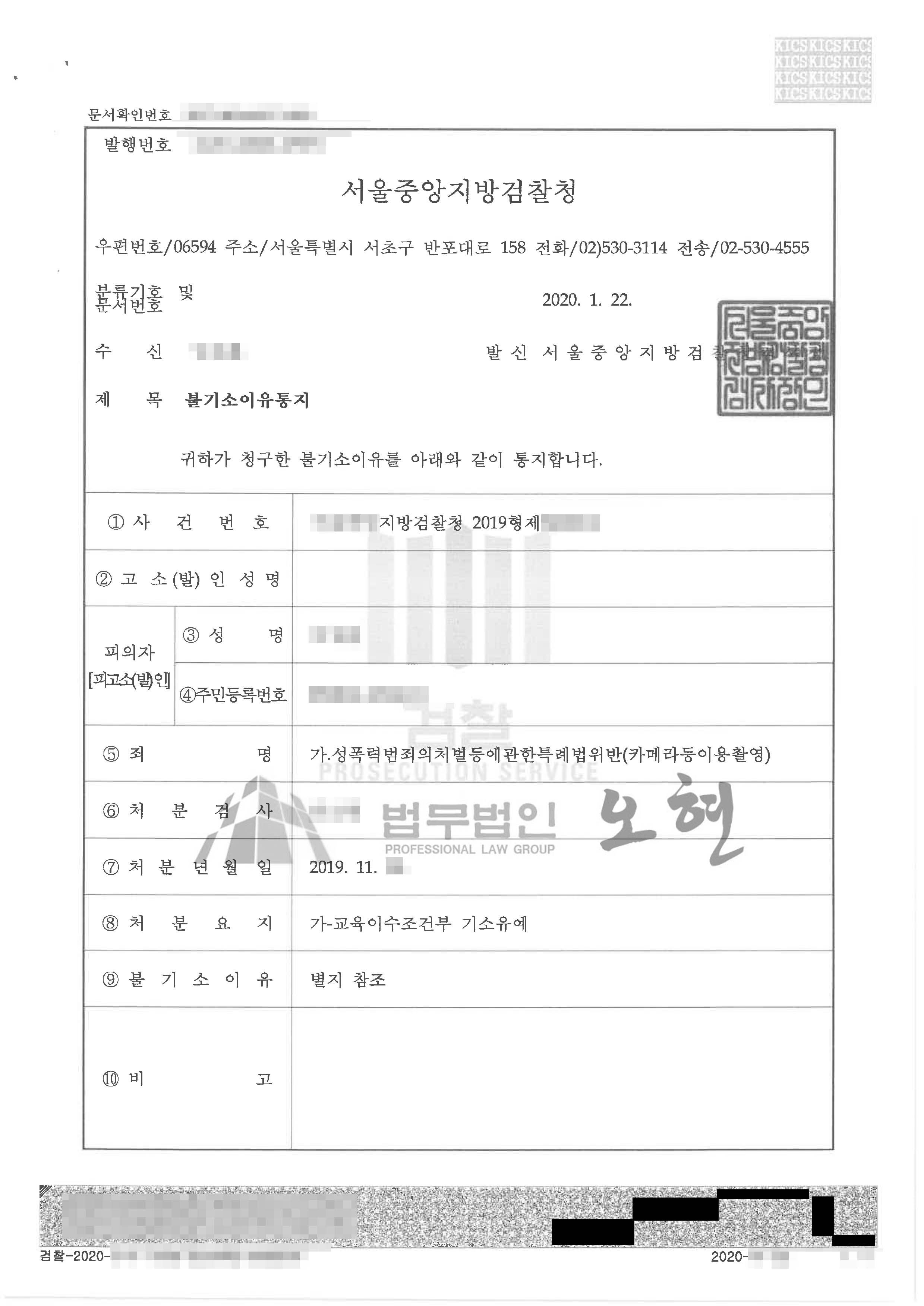 담당검사는 “피해자의 뒷모습이나 신체 일부만 촬영되어 있는 점”, “유포된 사진에 피해자의 얼굴이 보이지 않는 점” 등을 참작하여 교육이수조건부 기소유예 처분을 하였습니다.