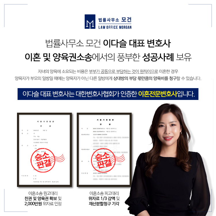 종로, 광화문역 인근에 위치한 법률사무소 모건은 이혼소송과 친권 및 양육권 조정에 풍부한 성공사례를 갖춘 이다슬 대표 변호사가 양육비 미지급 문제로 어려움을 겪고 계신 분들을 위한 자세한 법률상담과 대응을 도와드립니다. 상담예약 시 대표 변호사가 직접 상담해드리고 있으니 아래의 프로필로 문의하시기 바랍니다.