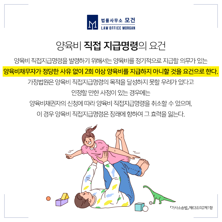양육비 직접지급명령 제도는 양육비채무자가 현재 회사를 다니고 있다면 활용할 수 있는 제도입니다. 양육비 채무자가 정당한 사유없이 2회 이상 양육비를 지급하지 않을 시 이혼 당시의 법원 판결문, 양육비 부담조서 등을 활용하여 가정법원에 양육비 직접지급명령을 신청할 수 있습니다.