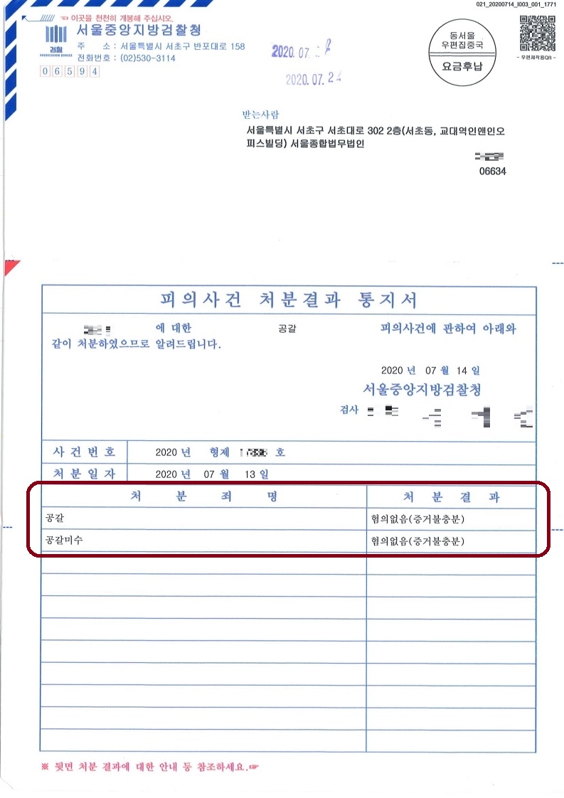 그로부터 얼마 지나지 않아, 공갈 등 구성요건에 해당하지 않음을 적극 항변하는 내용의 변호인의견서를 제출하였고, 수사기관과도 지속적으로 컨택하여 사건에 대한 의견을 피력해왔습니다.