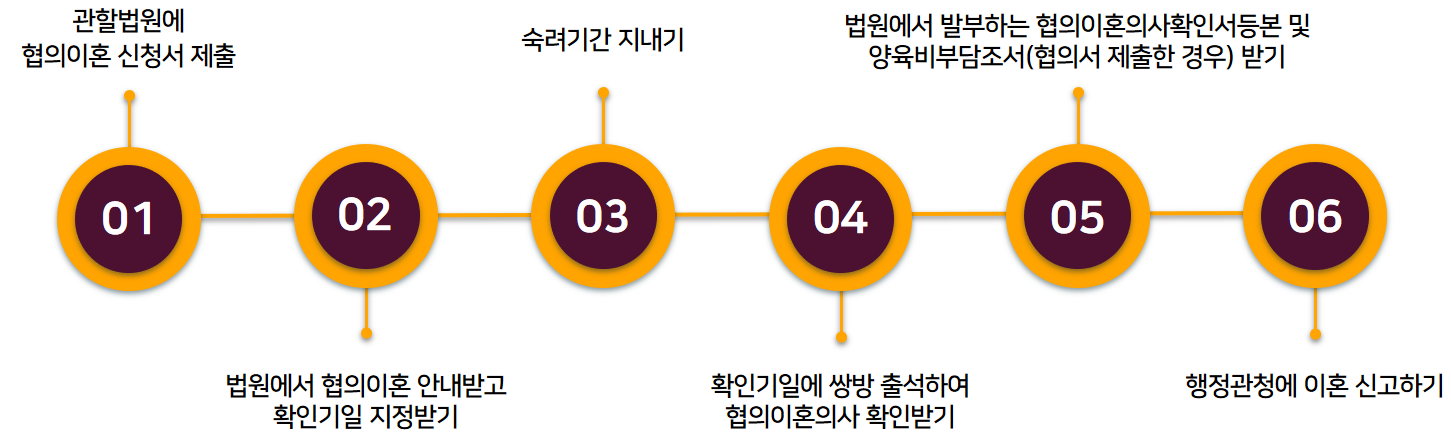 협의이혼의 절차는 먼저 가정법원에 협의이혼 의사 확인 신청하고, 이혼 안내 및 이혼 숙려기간(1개월/ 미성년자 자녀가 있는 경우 3개월)을 보내게 됩니다. 이후 확인 기일에 쌍방이 판사 앞에 출석하여 협의이혼 의사를 확인하고 이혼 확인서를 교부받아 3개월 내 등록기준지 또는 주소지 관할의 시·구청에 이혼신고를 함으로써 마무리됩니다.