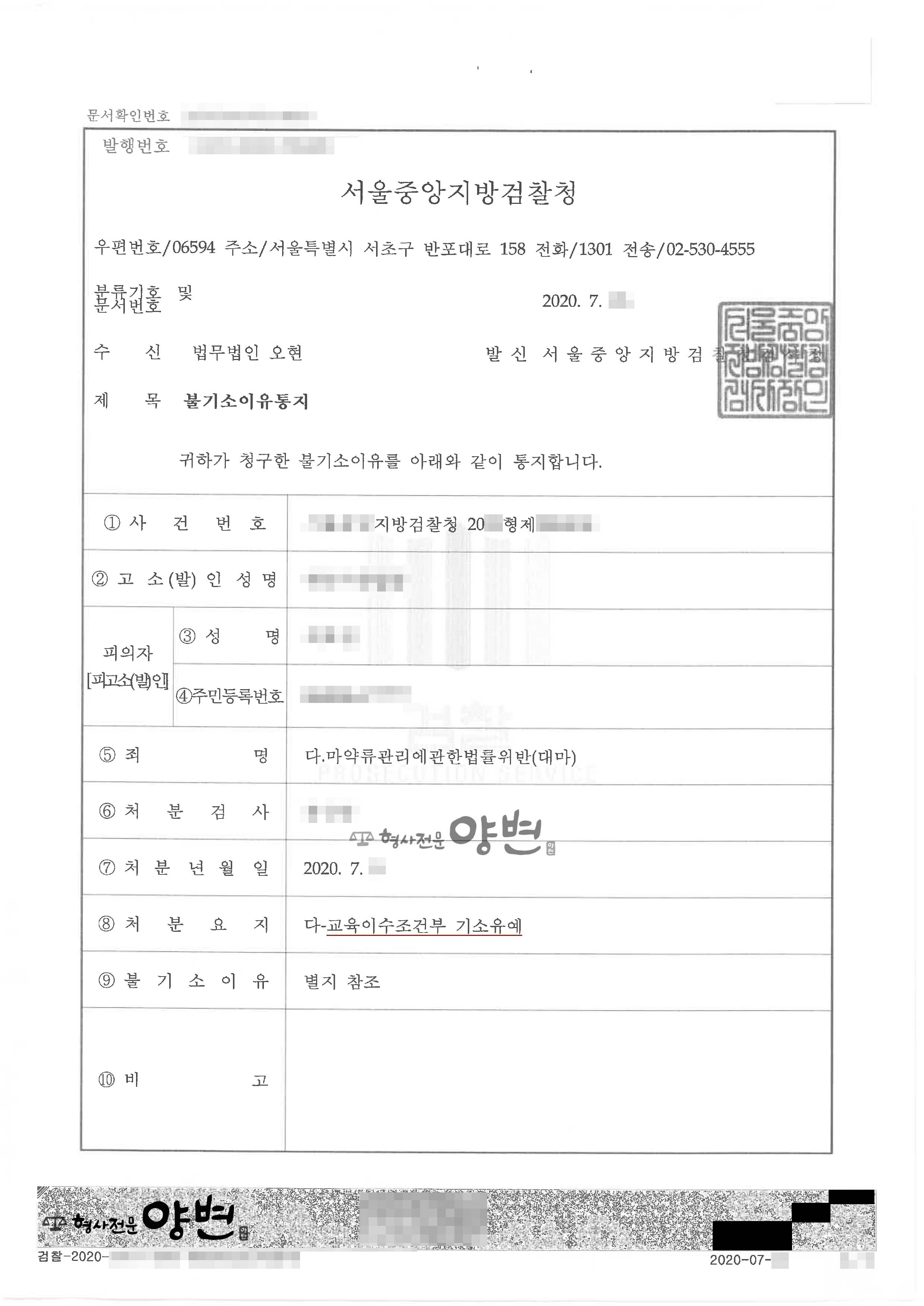 담당검사는 본 변호인의 주장을 받아들여 "형평성을 고려한다"며 교육이수조건부 기소유예 처분을 하였습니다.