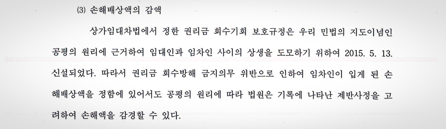 다만 아쉬운 점은 재판부가 공평의 원칙에 따라서 원고 청구 중 20%에 대한 손해배상액의 감액을 인정한 부분입니다. 상가임대차보호법에 의하면 감액에 대한 명시적인 규정이 없음에도 불구하고, 원고의 청구가 손해배상이라는 점에 근거하여 감액을 하였습니다.