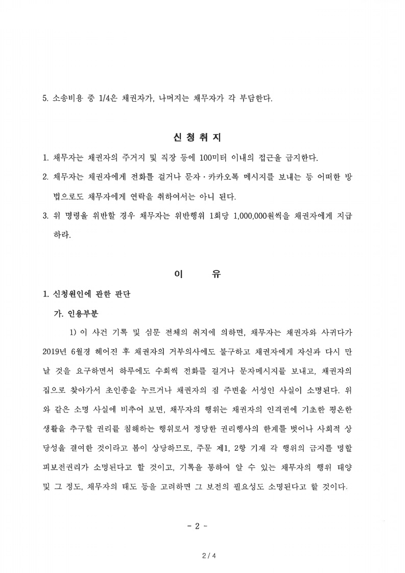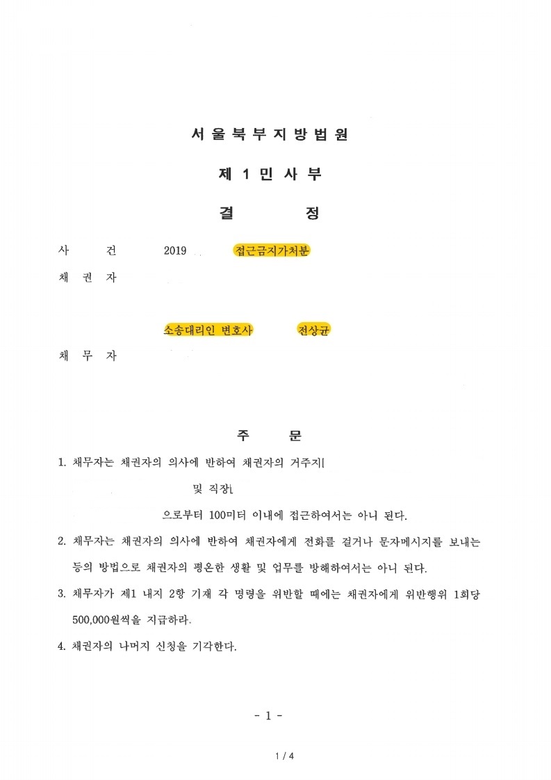 의뢰인은 전 남자친구의 지나친 연락과 다시 만나자는 요구로 일상생활이 불가능한 정도 였습니다. 옛 정이 있어서 형사 고소 등은 주저하고 있었지만 더 이상 전 남자친구의 접촉이 없었으면 하는 마음으로 민사상 접근금지 가처분을 요청하게 되었습니다.