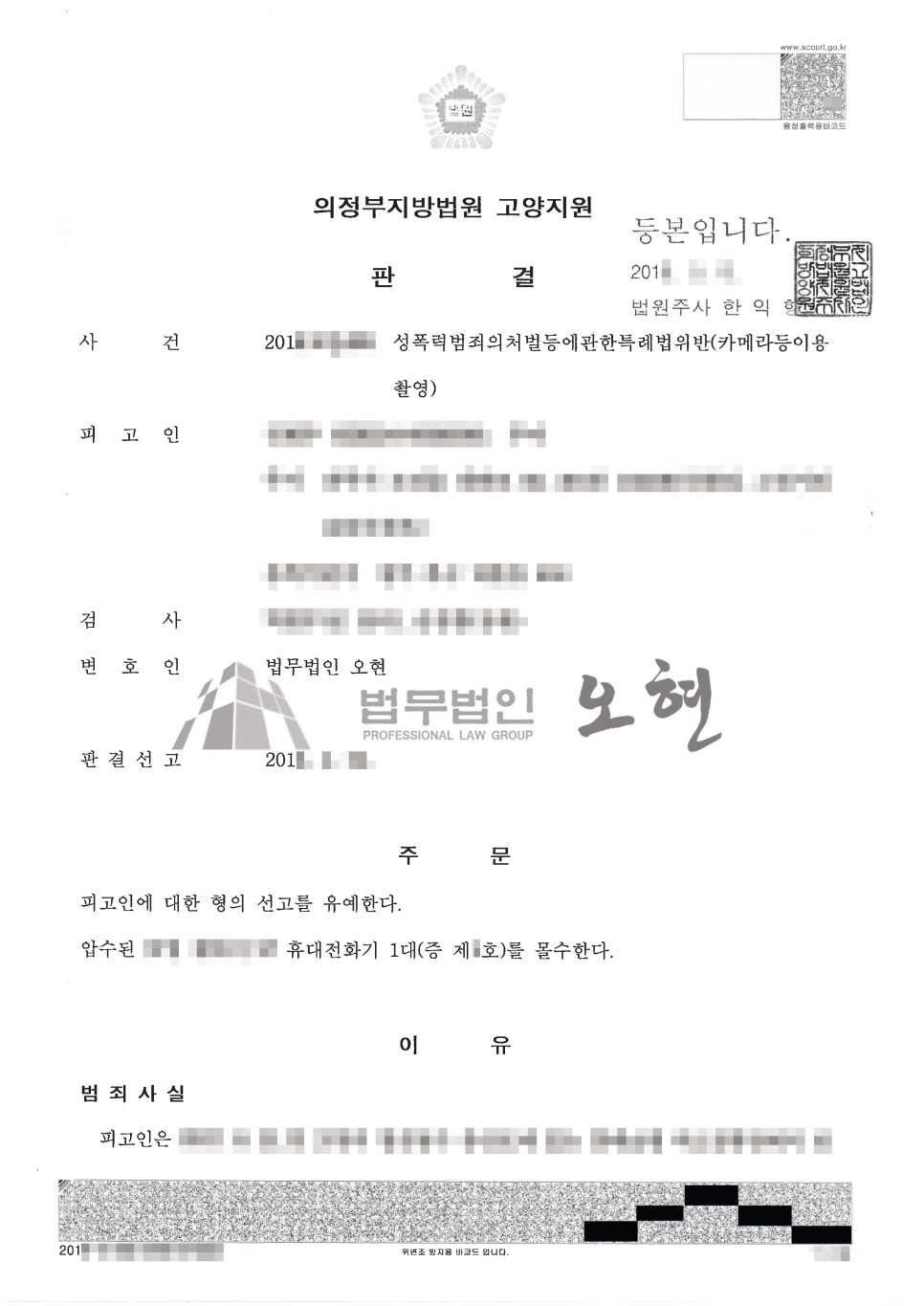 재판부는 의뢰인에 대하여 실질적으로 형벌을 부과하지 않는 선고유예 판결을 하였습니다.