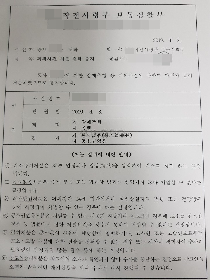 군인 사건은 일반적인 형사사건과 같이 '경찰, 검찰'에서 수사가 진행되지 않고, 추후 군검찰로 사건이 이송되어 군검찰에서 수사를 받게 됩니다.