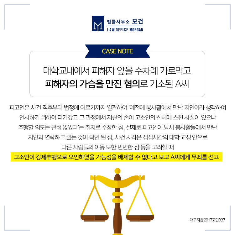 최근 대법원이 피고인이 회식 후 모텔을 가자면서 피해자의 손목을 잡아끌어 피해자를 추행하였다는 등의 사실로 기소된 사안에서 혐의 일부만 유죄로 판단해 벌금 300만원으로 감형한 2심을 파기하고 강제추행죄의 유죄취지로 사건을 원심법원 합의부로 돌려보냈습니다. '모텔에 가자고 하면서 피해자의 손목을 잡아끈 행위에는 이미 성적인 동기가 내포돼 있어 추행의 고의가 인정된다'고 본 것입니다.