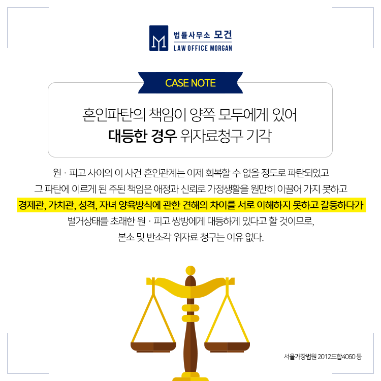 이혼 시 고려해야 할 사항 중 하나가 바로 '위자료' 인데요. 위자료는 이혼 시 모든 경우에 해당되는 것은 아닙니다. 위자료는 부부 일방의 잘못으로 이혼하게 된 사람의 정신적 고통을 위로하는 것을 목적으로 합니다. 예를 들어 배우자의 혼인파탄행위 그 자체에 대한 충격, 배우자와 제3자의 부정행위 등을 이유로 들 수 있습니다.